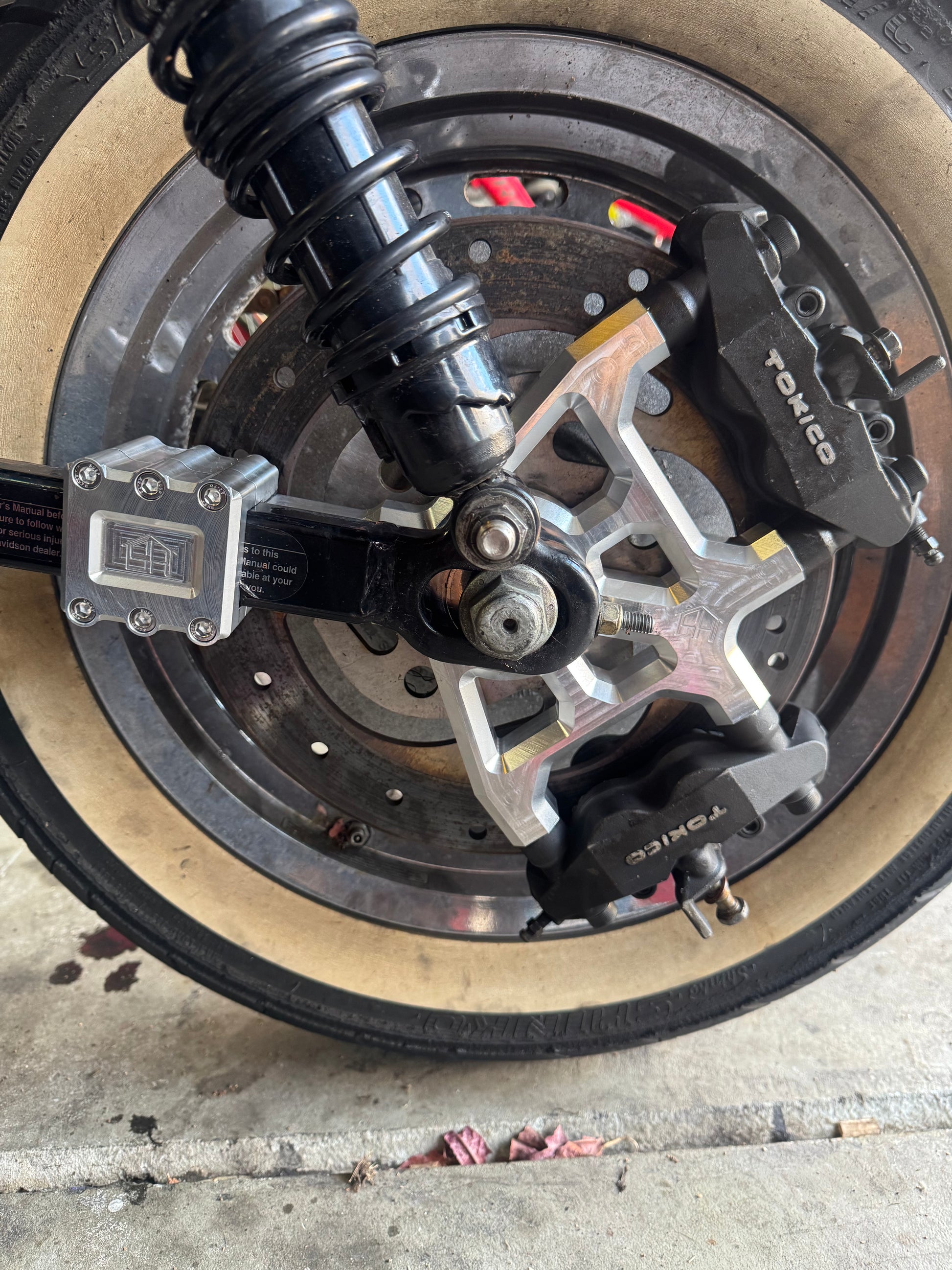 This new design is an industry first. If you own a 2004+ sportster you’re aware that the swing arms do not have a built in brake stop. The factory brake caliper bracket and the few dual caliper brackets on the market all beat up the swing arm and make installation a pain in the a** due to having to completely remove the tire and everything else to install and remove. Stunt House created a full billet bolt on brake stop that stays installed on the swing arm. We then created a dual caliper bracket that slides into that stop making installation and removal as easy as possible.